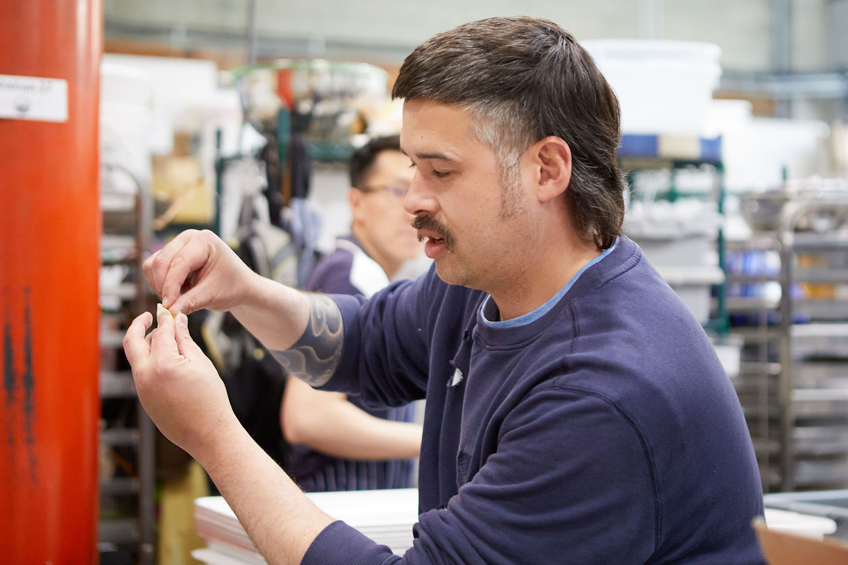 M: I arrive at the kitchen by 8:45-9:00 am, and I text my butcher for my order. While I wait for my delivery which usually comes within half an hour, I check on every piece of equipment. Pork belly is ground fresh every morning, and the meat is so fresh and fluffy. Just before 11:00 am, my staff arrives, and we start processing and mixing meat and vegetables by hand. I measure my recipe in privacy, and everything is scaled out so that my staff only needs to mix the ingredients. After that, we start folding with a folk. We have made over 750,000 dumpling to date! I have easily folded over 400,000. I am serious! I take 6 seconds for one dumpling. We freeze them on the same day and deliver them the next day. Repeat.